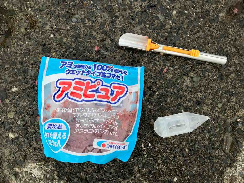 2.4m投げ竿に13号カレイ仕掛け、ロケットカゴに『アミピュア』です。