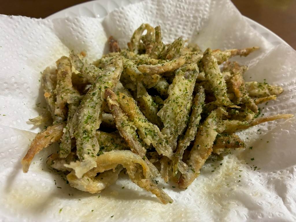 片栗粉をまぶして揚げ焼きした後、あおさを振りかけて完成、おいしく頂きました。