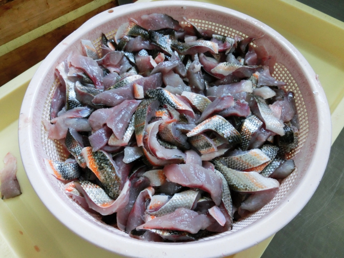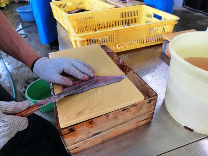 新鮮なアカハラを三枚におろして、18ミリ巾にカットしトレーに盛ります。