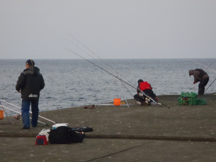みんなで一斉に撒き餌を始めると、面白いようにホッケが釣れ始めます。さっきまでとても静かだった釣り場が一斉に和やかに(笑)そのうち撒き餌の効果が出始めたのか、カレイやアブラコ・ソイなどが釣れはじめます。 ただ、この時点でも釣れているのは先端近くにいる人たちが中心、離れた場所にいた自分にはポツンポツンとしか釣れておらず少しずつフラストレーションが(^^;) そのうち自分のところまでホッケの群れが来るだろうと諦めずにコマセ仕掛けを打ち込んでいると・・・ |