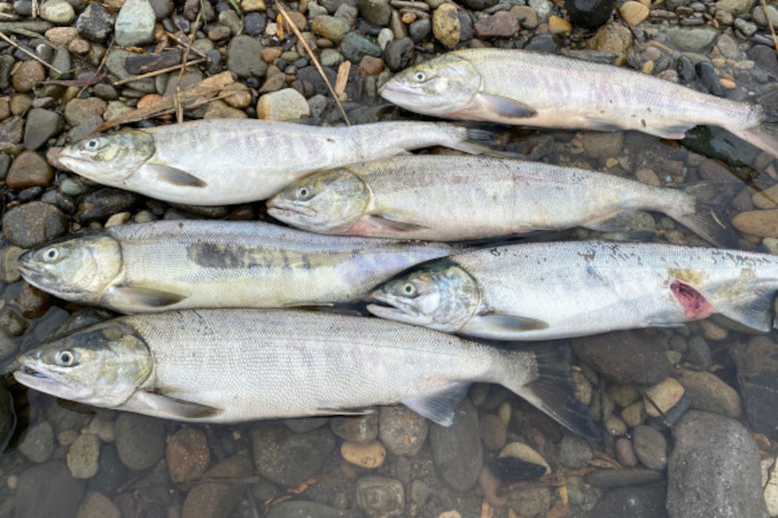 上のサケが♀です。優しい顔つきですね。下は♂ですが、顔がややいかついですね。