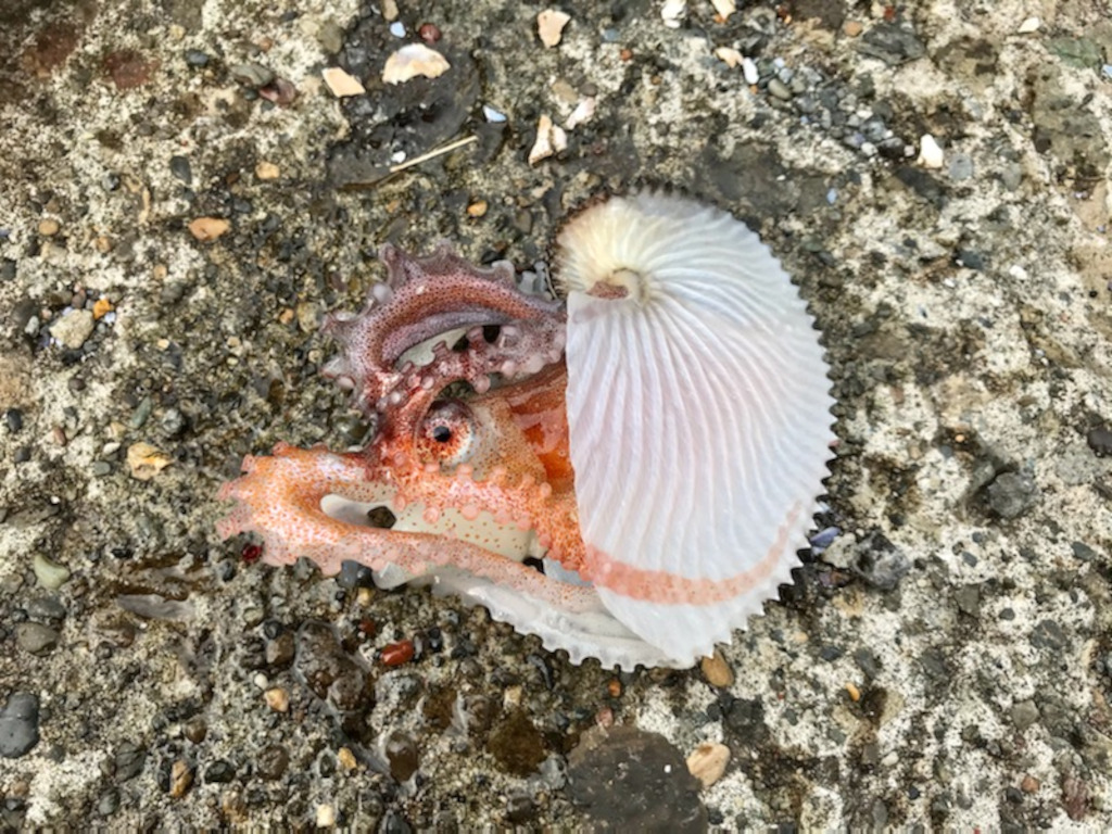一瞬、アオリイカ? と思いきや体に貝殻を背負っている…。