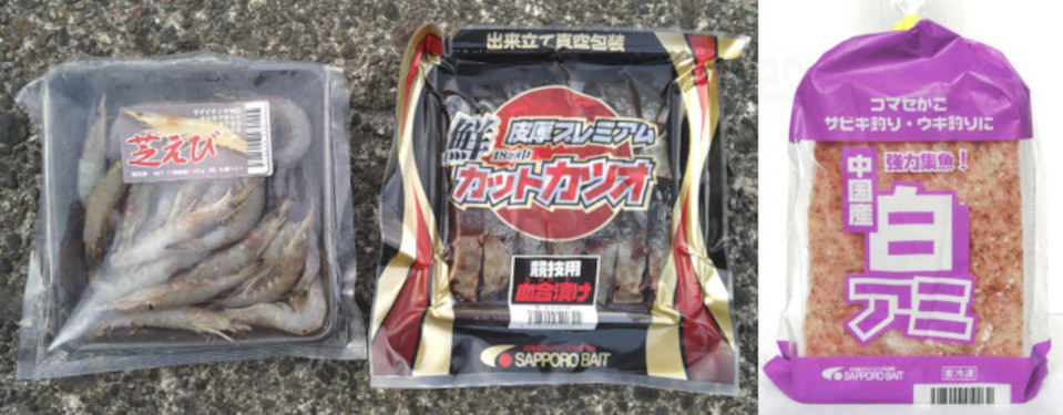 フカセバリ17号を使ったコマセネット仕掛けに、エサは「カットカツオ競技用血合漬け」と「芝えび」、コマセは「中国産白アミブロック」を使った。