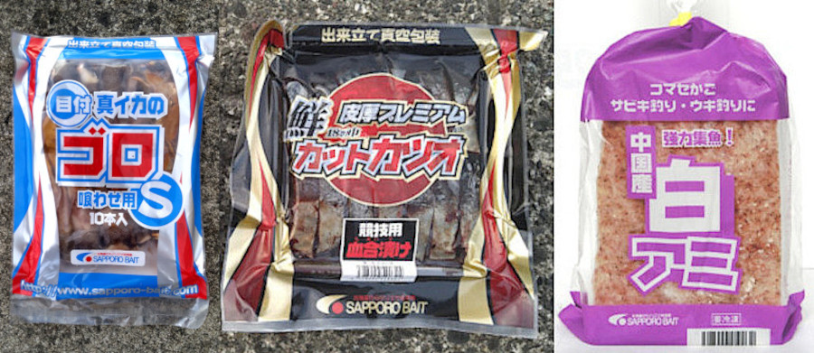 カジカ用に大きめのハリ(フカセバリ18号)を使ったコマセネット仕掛けを使い、エサは必需品ともいえる「カットカツオ競技用血合漬け」と「真イカのゴロ S」、コマセは「中国産白アミブロック」。