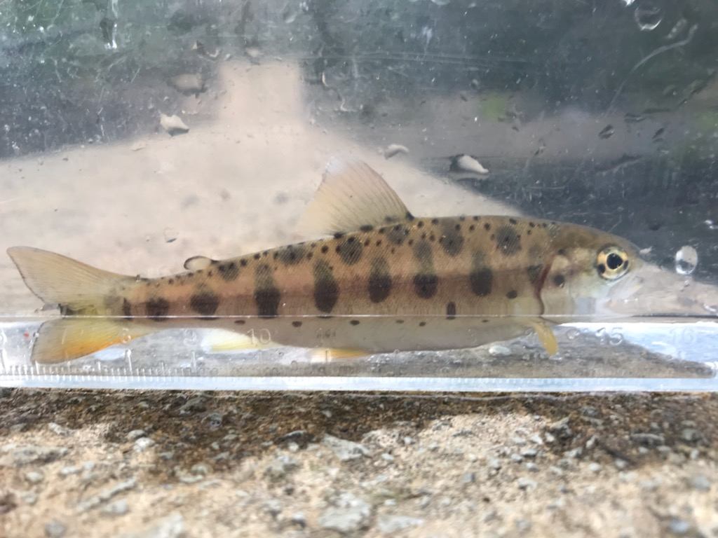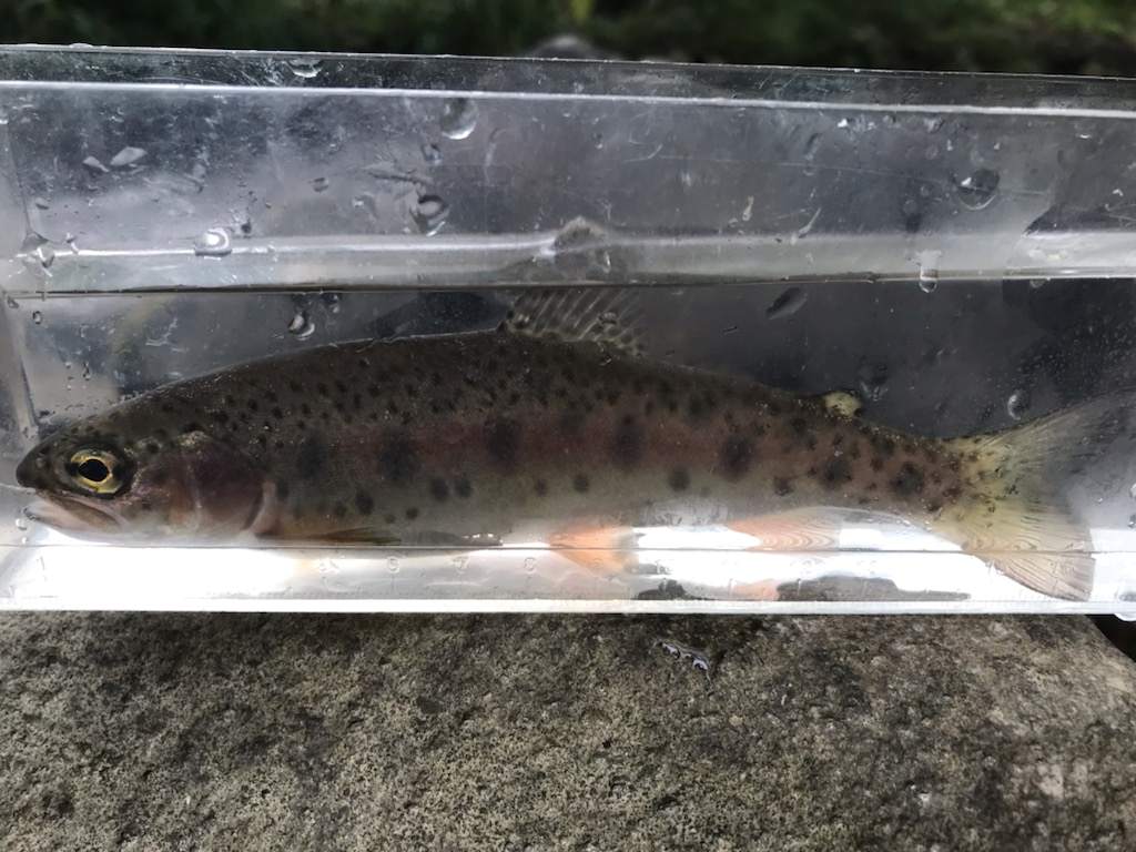 小型のヤマメがヒット。その後小さいながらニジマス、ヤマメ、ハナカジカがぽつぽつヒット。
