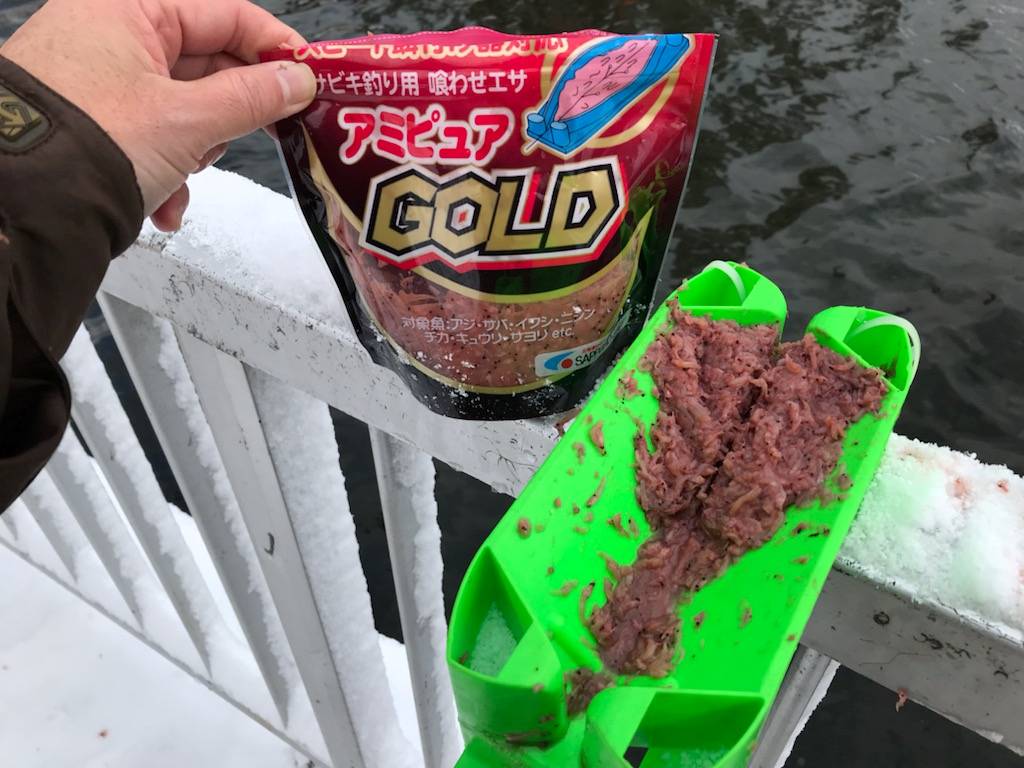 2号磯竿4.5mに2号スピード仕掛け、スピード餌付け器に『アミピュアGOLD』です。